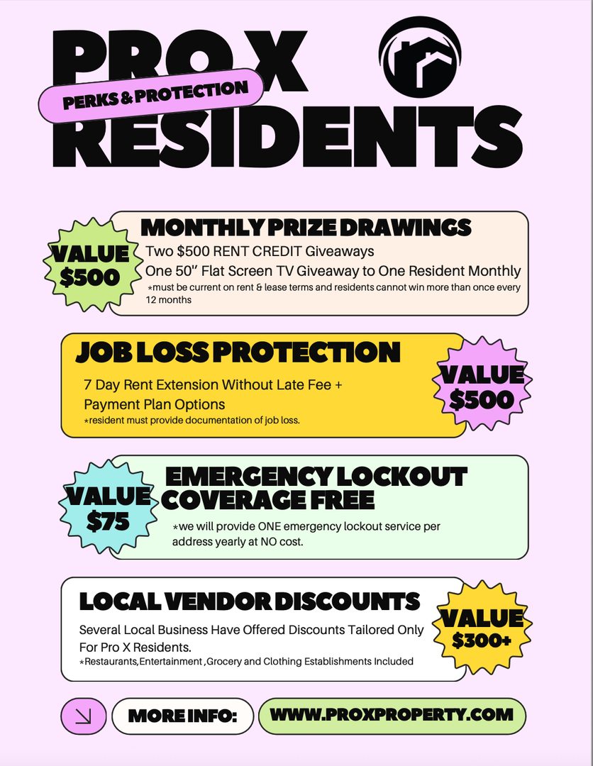 All Pro X Property Management residents are enrolled in the Resident Benefits Package (RBP) for $40.00/month which includes renters insurance, HVAC air filter delivery (for applicable properties), credit building to help boost your credit score with timely rent payments, $1M Identity Protection, our best-in-class resident rewards program, and much more! Renter’s insurance is a requirement to rent from Pro X.