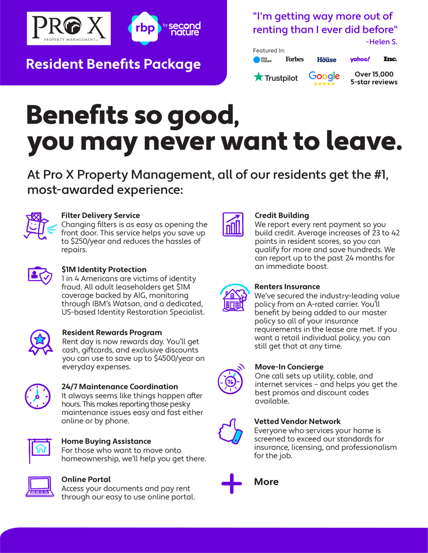 All Pro X Property Management residents are enrolled in the Resident Benefits Package (RBP) for $40.00/month which includes renters insurance, HVAC air filter delivery (for applicable properties), credit building to help boost your credit score with timely rent payments, $1M Identity Protection, our best-in-class resident rewards program, and much more! Renter’s insurance is a requirement to rent from Pro X. We also have a Renter's Insurance Only option for residents at $19.95/month.